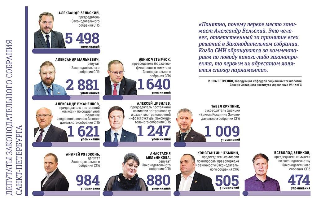 Издание «Петербургский дневник» и аналитическая система «Медиалогия» определили, каких петербургских депутатов Законодательного собрания чаще всего цитировали СМИ. Так, первое место занял председатель Заксобрания Александр Бельский с 5498 упоминаниями.