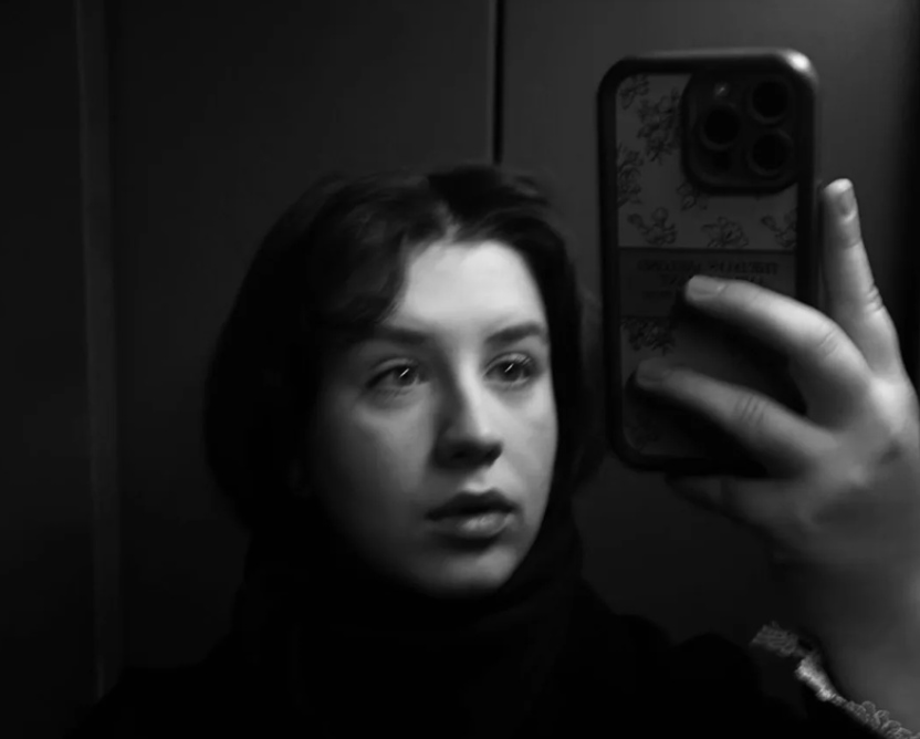 Одна из звёзд фильма "День радио" выбрал для поздравительного поста чёрно-белую фотографию. Именинница сняла саму себя с помощью отражения в зеркале. На кадре в стиле "нуар" дочь Полицеймако распустила чёрные волосы и пристально и загадочно смотрит в объектив камеры.