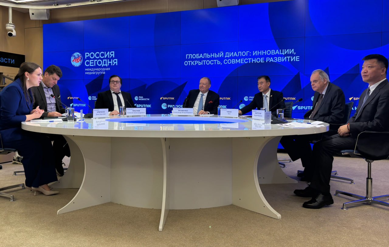 Глобальный диалог: инновации, открытость, совместное развитие. Этой теме был посвящен видеомост МоскваПекин, который прошел сегодня в Международном мультимедийном пресс-центре медиагруппы «Россия сегодня». В обсуждении приняли участие представители Госдумы, российского экспертного сообщества и медиа, а также временный поверенный в делах Посольства КНР в РФ Чжан Вэй, представитель китайского бизнеса в России Сунь Бохуэй и главный редактор Медиакорпорации Китая (CMG) Шэнь Хайсюн.
