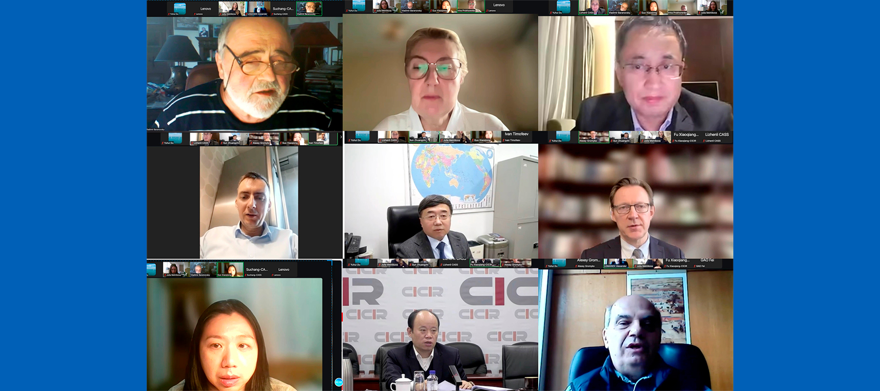 С докладами выступили директор Китайской академии современных международных отношений Фу Сяоцян, директор Института Европы РАН, член РСМД Алексей Громыко, вице-президент Китайского университета международных отношений Гао Фэй, заместитель директора по научному развитию ИМЭМО им. Е.М. Примакова РАН, член РСМД Александр Ломанов, профессор Института международных отношений Ло Инцзе, профессор кафедры международных отношений и внешней политики России МГИМО МИД России, член РСМД Владимир Барановский, заместитель главы администрации Совета по делам стратегического взаимодействия Китая и России КАОН Го Сяоцюн и заведующая отделом международно-политических проблем ИМЭМО им. Е.М. Примакова РАН Ирина Прохоренко.