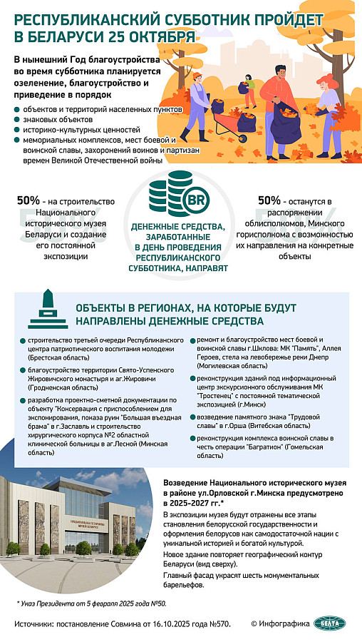 Из денежных средств, заработанных от проведения осеннего субботника, 50% пойдут на строительство Национального исторического музея Беларуси и создание его постоянной экспозиции. Еще 50% останутся в распоряжении облисполкомов, Минского горисполкома с возможностью их направления на конкретные объекты.