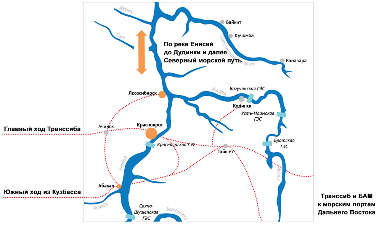 Транспортная схема магистральных железнодорожных и внутренних водных путей Центральной Сибири. Расположенный на Транссибе Красноярский порт более привлекателен грузоотправителям, но в маловодные годы судам приходится уходить на север недозагруженными, чтобы безопасно преодолеть Казачинский порог