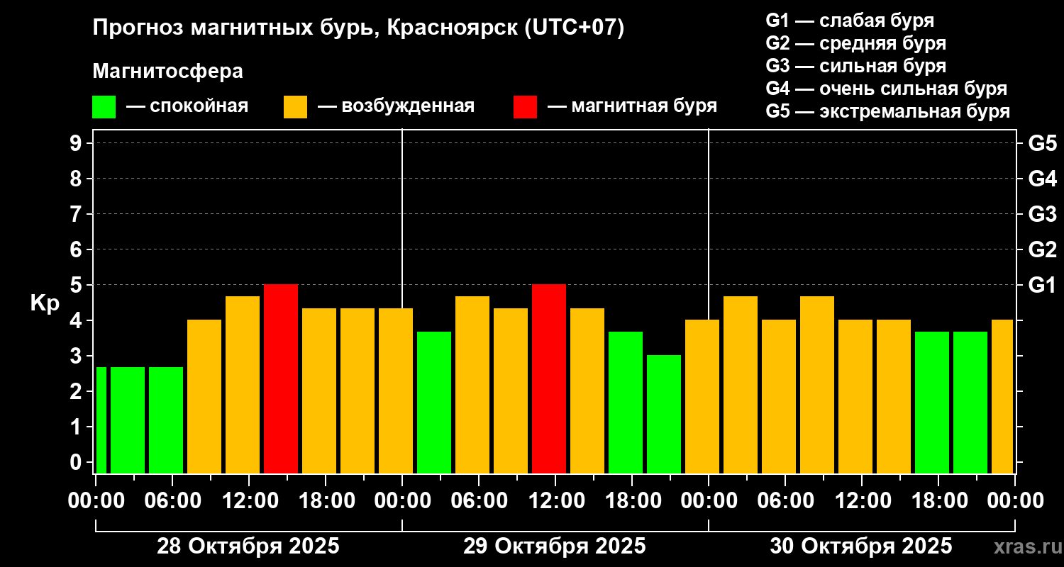 По прогнозу лаборатории солнечной астрономии ИКИ и ИСФЗ, бури усилились 28 октября. Днем возмущения достигнут пяти баллов.