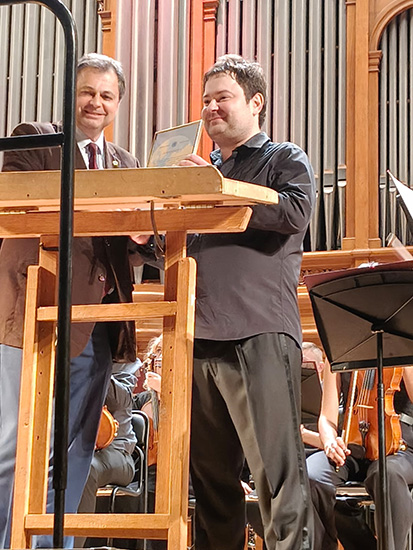 Скрипач-виртуоз Иван Почекин и главный дирижер Большого симфонического оркестра имени П.И. Чайковского Арсентий Ткаченко