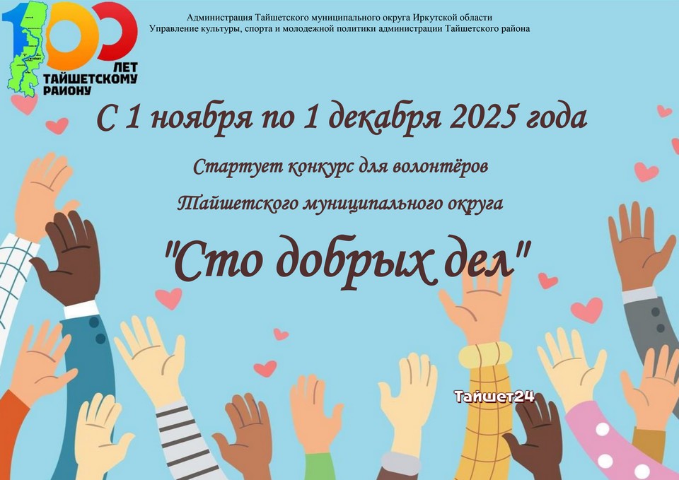 С 1 ноября по 1 декабря 2025 года в Тайшетском муниципальном округе пройдёт масштабный конкурс «Сто добрых дел», приуроченный к 100-летию Тайшетского района. Мероприятие направлено на выявление и поддержку лучших волонтёрских отрядов. Организатором выступает Управление культуры, спорта и молодёжной политики Тайшетского района при поддержке Администрации Тайшетского муниципального округа.