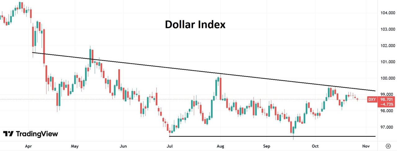 Индекс доллара по-прежнему демонстрирует низкую волатильность, а котировки остаются в рамках того ценового диапазона, который сформировался за последние 4 месяца: 96,5-99,5. Только резкое изменение риторики ФРС может вытолкнуть доллар из этого ценового затишья.