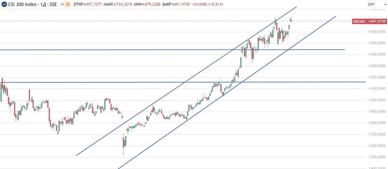 Индекс CSI 300 продолжает свой рост, пробив все уровни сопротивления. Индекс остается перекупленным (RSI = 61), возможна коррекция до уровня 4450. Однако индекс остается в восходящем канале, и в случае продолжения ралли возможно возвращение к значениям 2021 года (4800 – 5900).