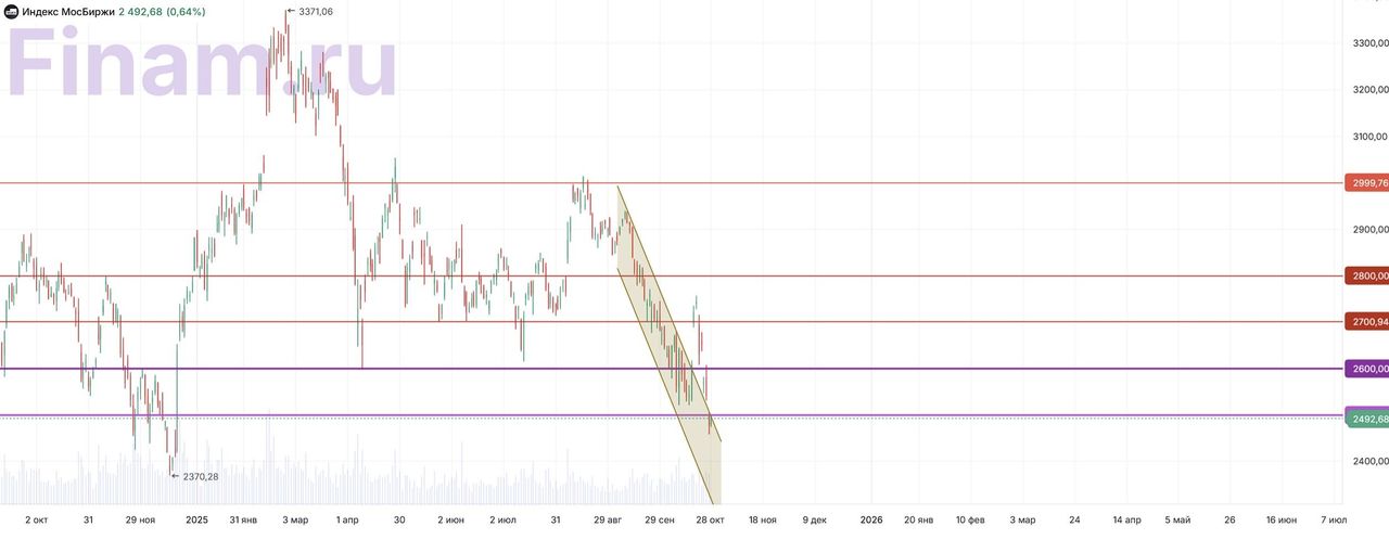 В Индексе МосБиржи наблюдается технический отскок на фоне перепроданности, однако значение остается в рамках нисходящего канала, но у верхней границы, в отсутствии позитивных новостей ожидается продолжение падения до уровня 2400.