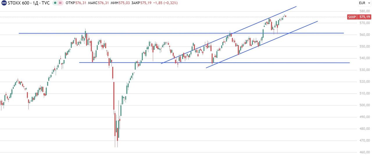 Индекс Stoxx 600 продолжает находиться в границах восходящего канала на историческом максимуме. Индикатор RSI равен 62, что говорит о перекупленности и возможной коррекции до нижней границы канала и уровня поддержки 561.