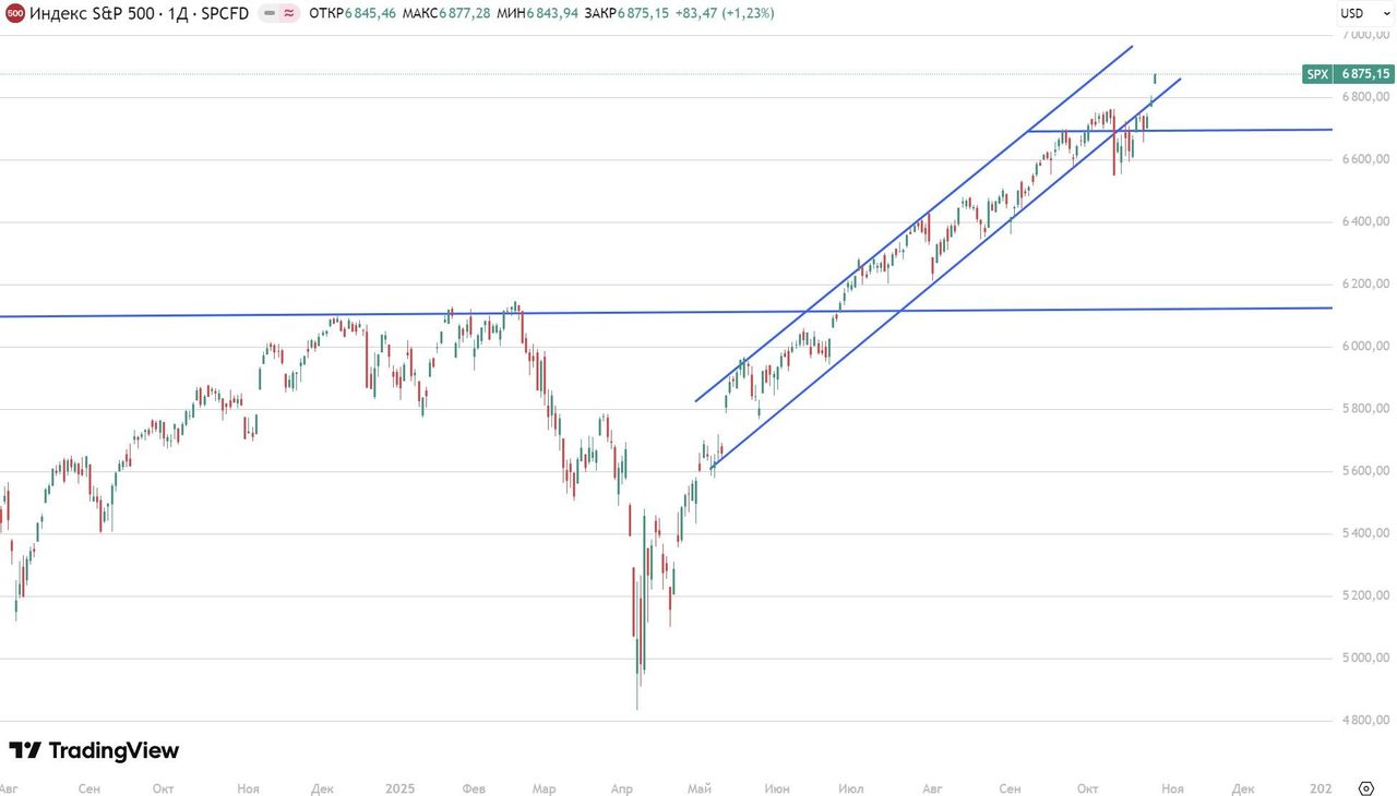 В последней торговой сессии S&P 500 продолжил рост, завершив день на отметке 6875. Индикатор RSI составляет 68, что говорит о продолжении нахождения индекса в зоне перекупленности. Ближайшей целью для быков остается восхождение до верхней границы восходящего канала и очередной исторический рекорд 7000 пунктов, в случае коррекции можно ждать индекса у уровня поддержки 6700 пунктов.