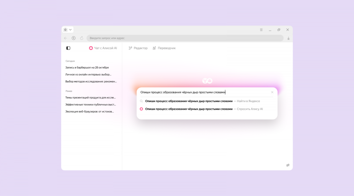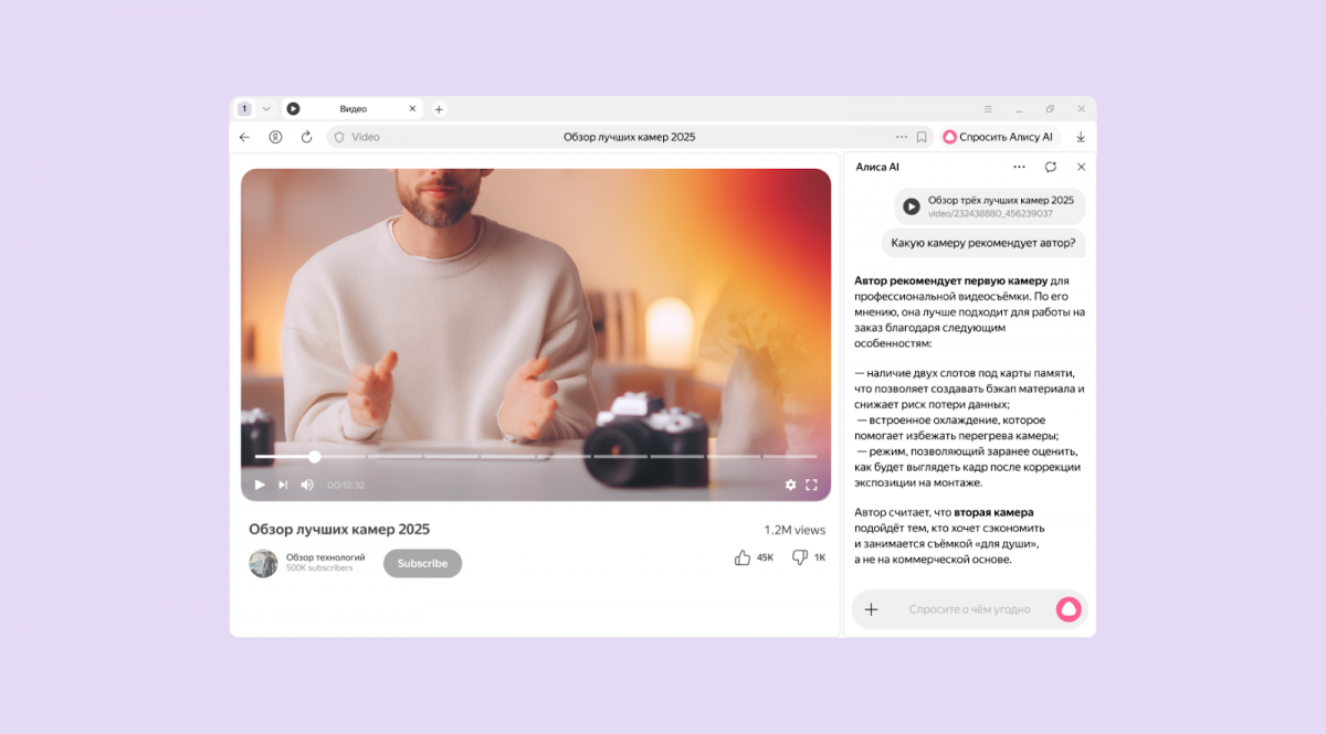 В Яндекс Браузере Алиса AI сможет анализировать содержимое вкладки — например, найти нужные данные в длинном PDF-документе или ответить на вопрос по видео. Общение с ней доступно прямо в умной строке и на стартовой странице Браузера. Подробнее.