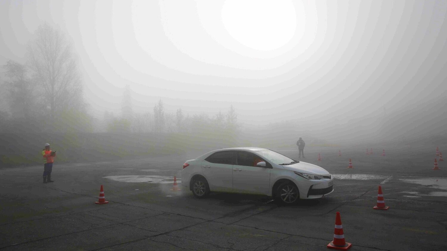 Погодные условия добавили испытанию сложности: полигон оказался окутан плотным туманом — как в типичное межсезонье, когда водителям приходится быть особенно внимательными. В ходе практического этапа участникам необходимо было максимально быстро и аккуратно выполнить пять элементов: змейку и заезд в бокс задним ходом, разворот в замкнутом пространстве, параллельную парковку и проезд через препятствие правыми колесами автомобиля.