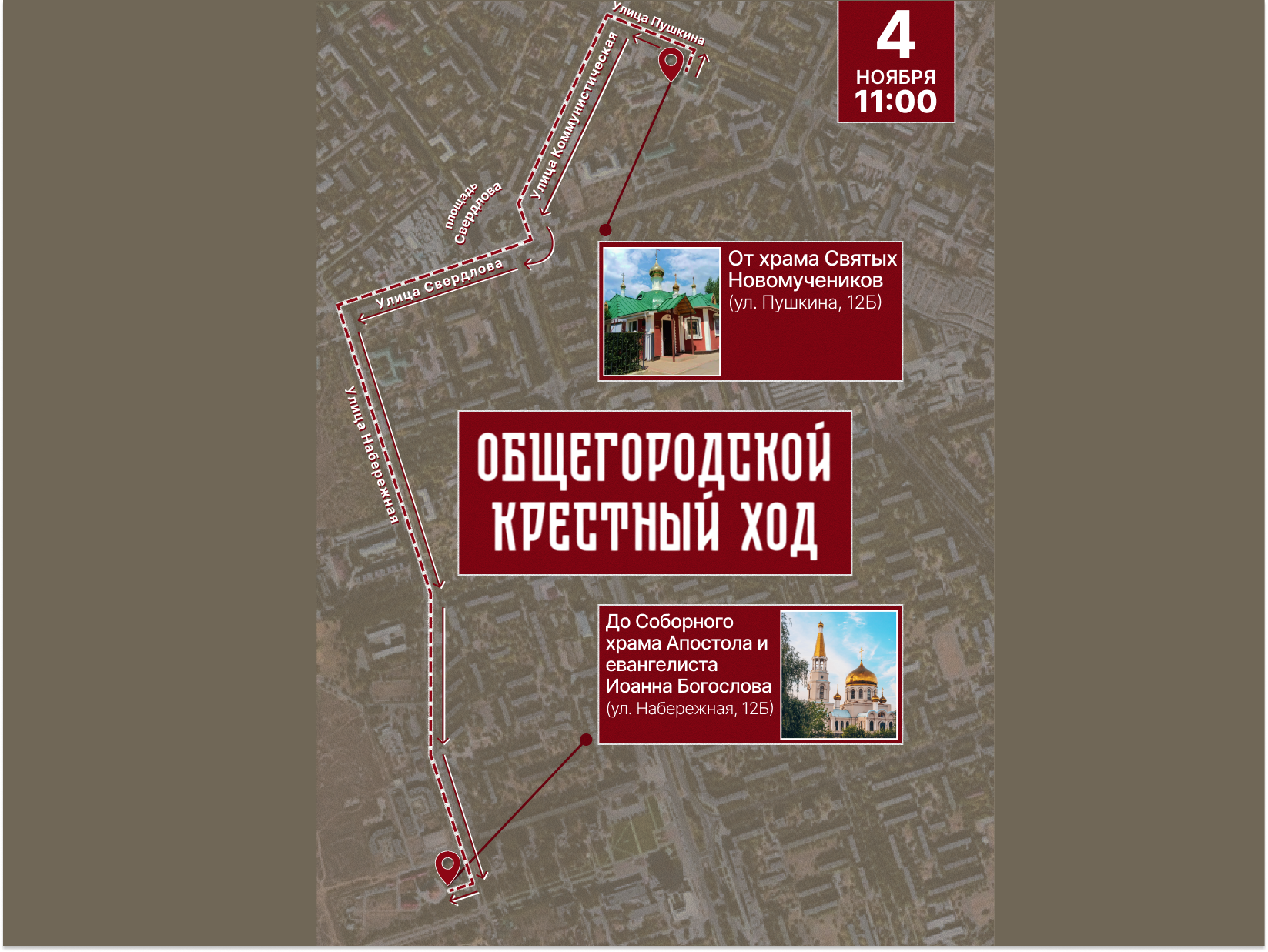 Крестный ход начнется в 11:00 от храма Святых новомучеников на территории больничного комплекса (ул. Пушкина, 12б). Колонна верующих с хоругвями и иконами пройдет по улице Пушкина, далее по улице Коммунистической, выйдет на кольцо площади Свердлова, затем проследует по улице Свердлова с выходом на улицу Набережную, по которой дойдет до конечной точки – Соборного храма Иоанна Богослова. Здесь будет совершен молебен перед Казанской иконой Божией Матери.