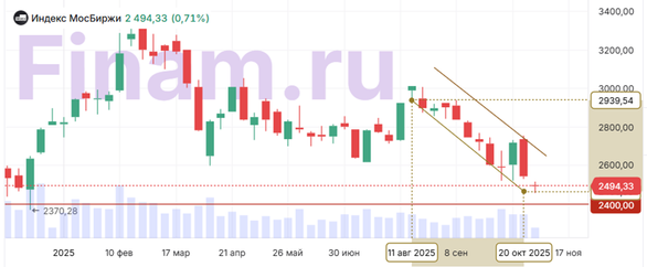 Индекс МосБиржи сохраняет технический отскок после недавней коррекции и торгуется вблизи отметки 2494,3 пункта. Однако при сохранении давления на рынок существует риск возобновления снижения с целевым уровнем в районе 2400 пунктов.