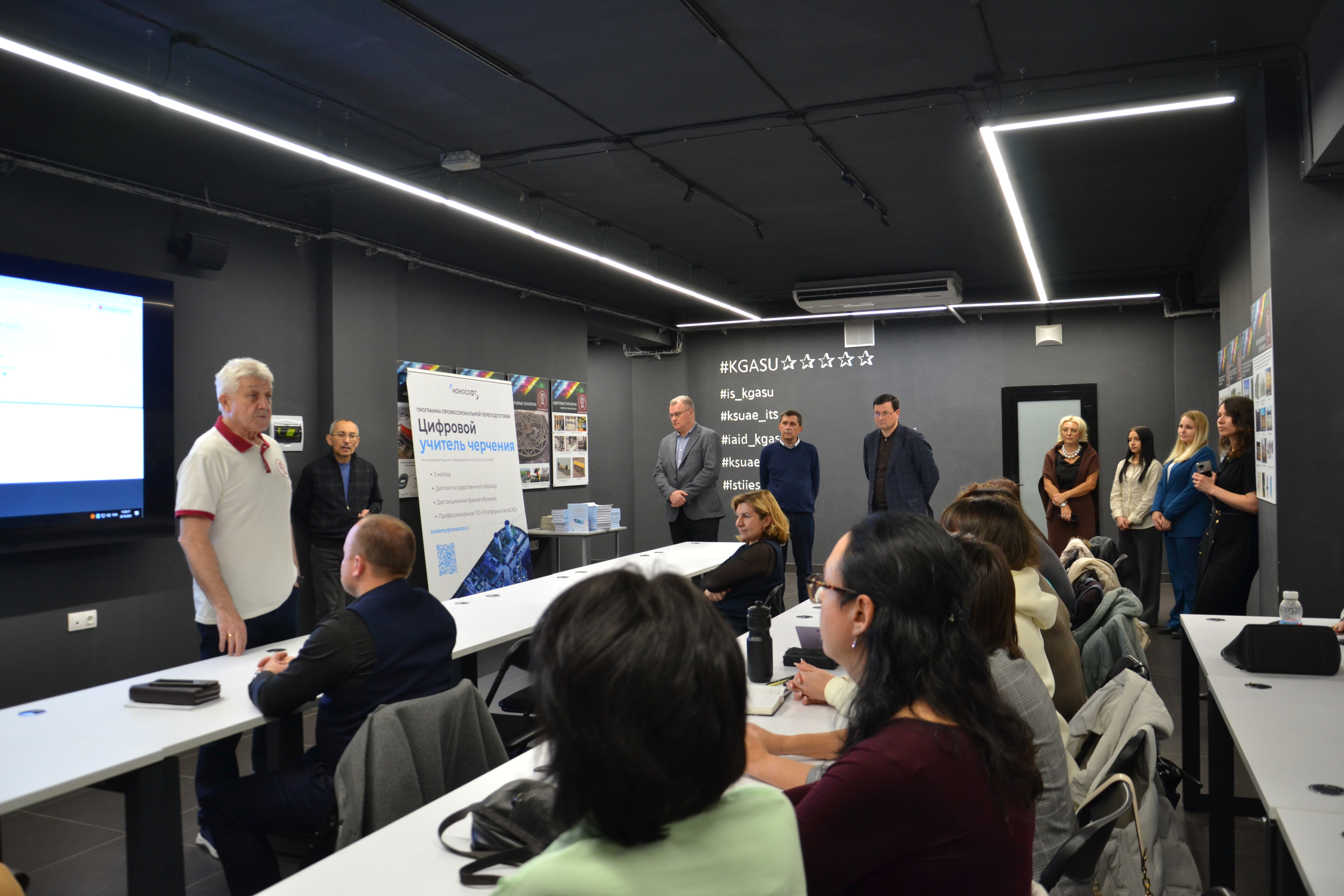 В рамках церемонии открытия для слушателей программы провели экскурсию по научно-образовательным центрам КГАСУ и организовали первое ознакомительное занятие по работе с отечественным программным обеспечением – Платформой nanoCAD. Именно это решение станет основным цифровым инструментом для будущих «цифровых учителей черчения».