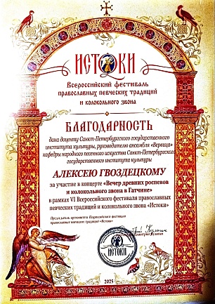 Ансамбль древнерусского певческого искусства «Веревица» кафедры русского народного певческого искусства СПбГИК (зав. каф. – профессор В.М. Сивова) под руководством доцента А.А. Гвоздецкого принял участие в концерте «Вечер древних роспевов и колокольных звонов в Гатчине», состоявшемся в Духовно-просветительском центре Покровского собора г. Гатчина в рамках Всероссийского фестиваля православных певческих традиций и колокольного звона «Истоки» 26 октября 2025 года.