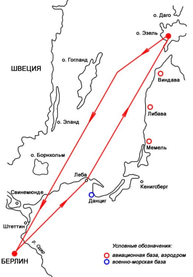 В 21.00 7 августа в воздух поднялась особая ударная группа из 15 бомбардировщиков ВВС Балтийского флота под командованием командира полка полковника Преображенского, загруженных бомбами ФАБ-100 и листовками (их маршрут – на схеме). Гречишников возглавлял вторую авиагруппу вслед за флагманской.