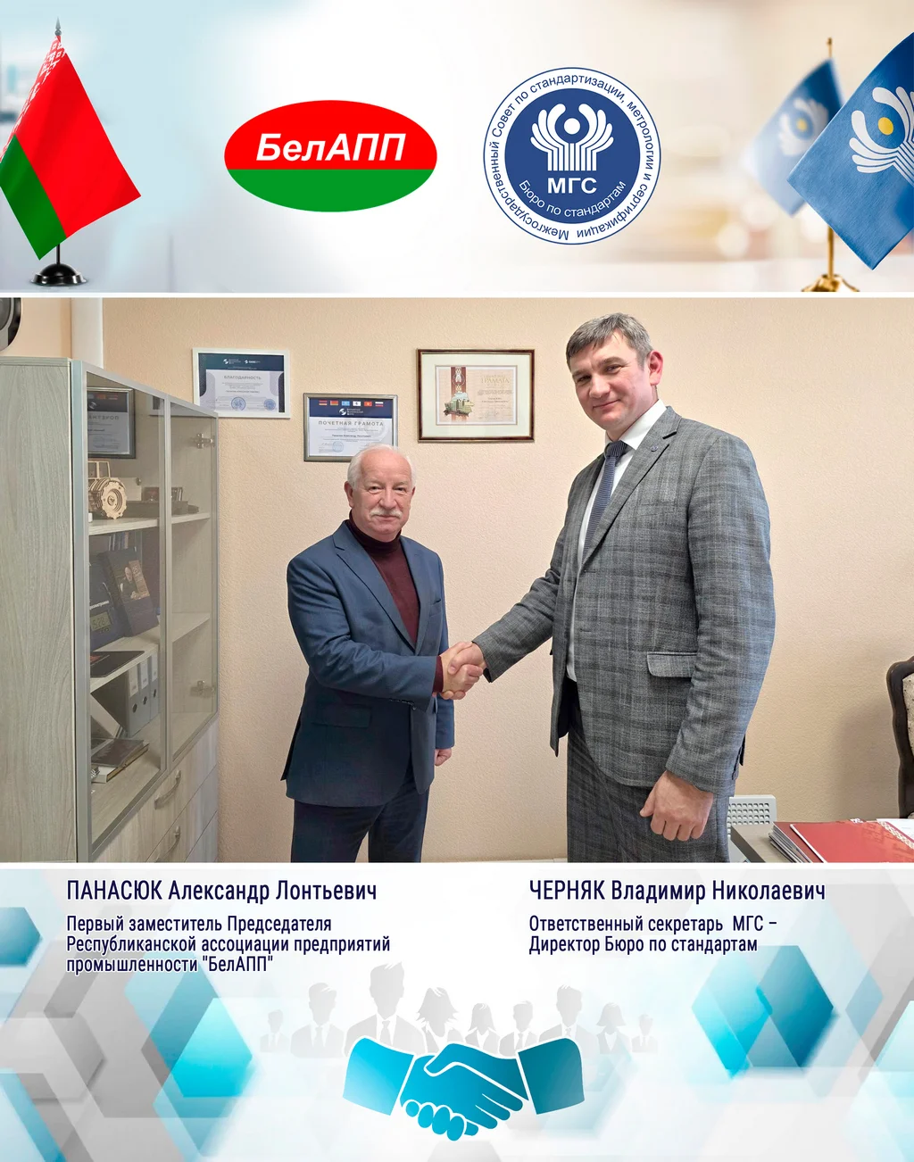 В соответствии с соглашением о сотрудничестве между Межгосударственным советом по стандартизации, метрологии и сертификации и Республиканской ассоциацией предприятий промышленности «БелАПП» 29 октября 2025 года состоялась рабочая встреча с Первым заместителем Председателя Ассоциации Панасюком Александром Леонтьевичем.