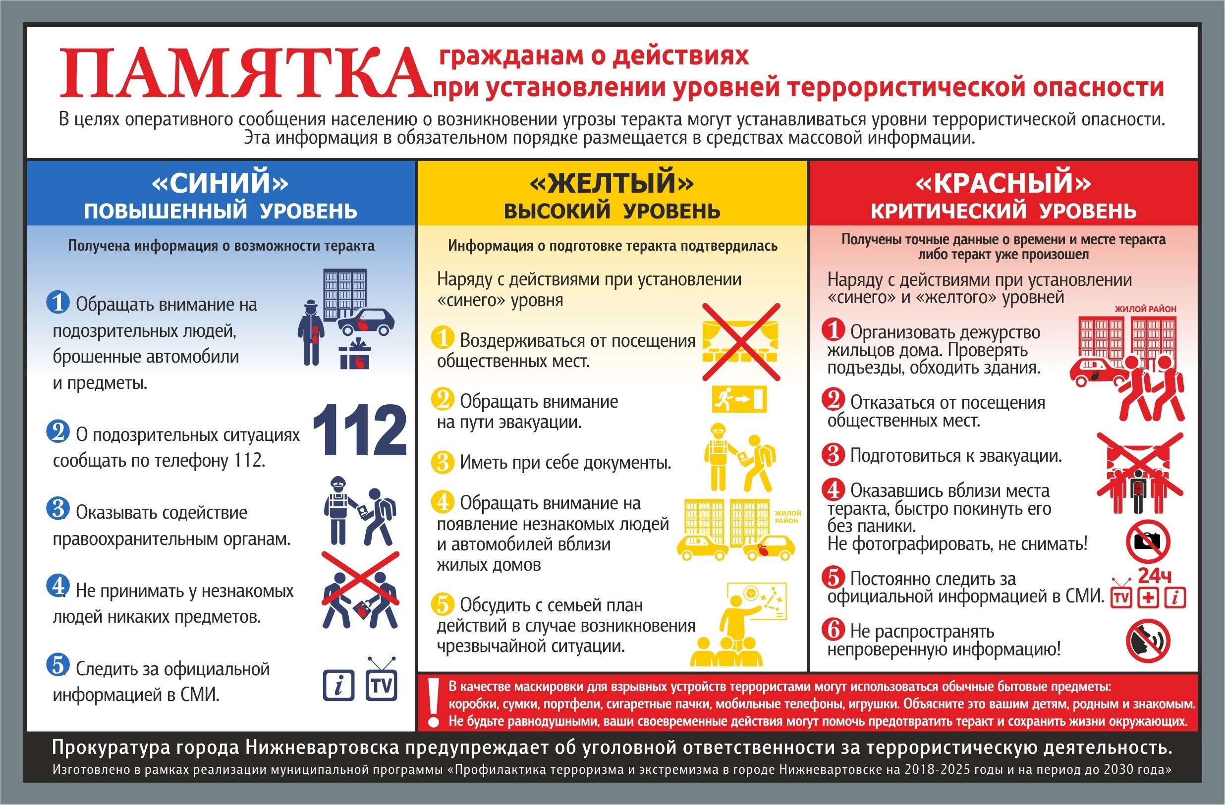 При обнаружении подозрительных предметов (коробок, сумок, пакетов и т.д.), взрывчатых веществ, оружия – не оставляйте этот факт без внимания. Не приближайтесь к найденным предметам, не трогайте и не прикрывайте их. Незамедлительно сообщите о находке по телефонам: 102 или 112.