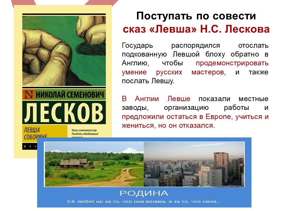 Сам видел это, когда по гранту поехал в Америку учиться, мне было интересно все это, посмотрел, действительно очень многих наших соотечественников встречал, и врачей, и учёных, которые уехали в Америку и там теперь работают. Да, они живут в достатке, это можно даже в некоторых случаях назвать «сытой» жизнью, но разве только сытой жизнью определяется благополучие человека? Конечно, нет. Есть такое понятие, как Родина.И произведение Н.С. Лескова «Левша» как раз учит нас этому: примером для нас становится Левша. Он никогда не видел сытой жизни, всю жизнь работал, да и работа у него была тяжелая, кропотливая, и вдруг ему предлагают все блага: поселиться в апартаментах, дают возможность выбрать невесту, готовы предоставить экипаж, изысканнейшие кушания предлагают. А у него тоска… по Родине, он не мог жить без своей Родины. И хочет уехать, что бы ему ни обещали. Вот это ситуация, когда человек через свои внутренние ощущения, через понятие совести понимает, что у него есть Родина, которую он не готов оставить, обменять на комфорт.