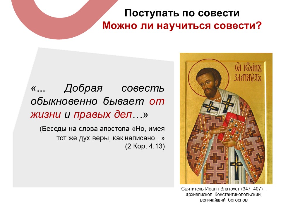 Один из отцов Церкви, святитель Иоанн Златоуст, святой нашей Церкви, говорил: «Добрая совесть обыкновенно бывает от доброй жизни и праведных дел». Добрая совесть укрепляется, развивается, только когда мы живем правильно и совершаем добрые дела, то есть поступаем в соответствии с тем, что входит в понятие «нравственный иммунитет»: участие, помощь, уважение.