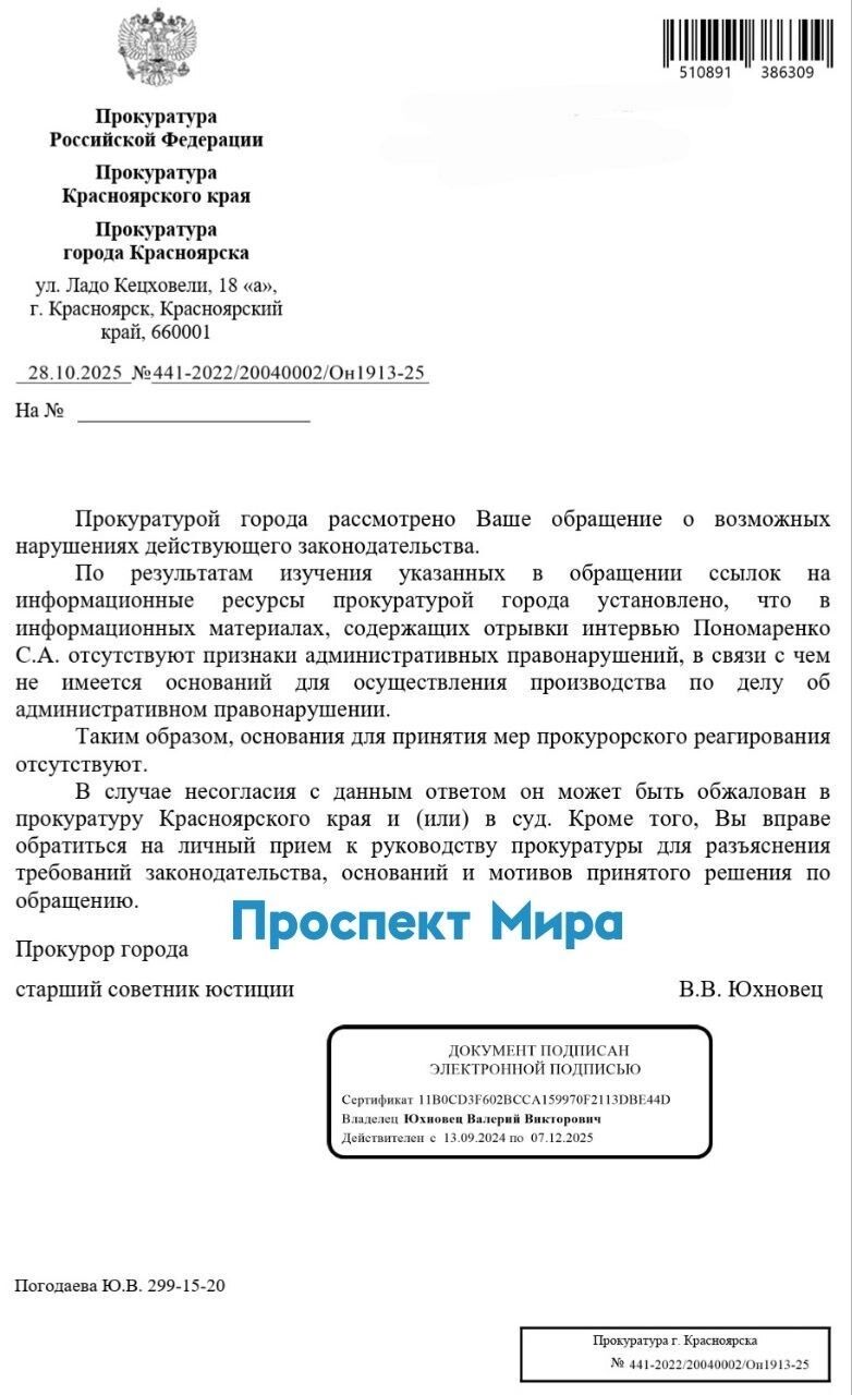 «Проспект Мира» обратился за комментарием в прокуратуру. Помощник прокурора края по связям со СМИ Тамара Чуприкова рассказала, что ответ, который получил красноярец, действительно прислала прокуратура.