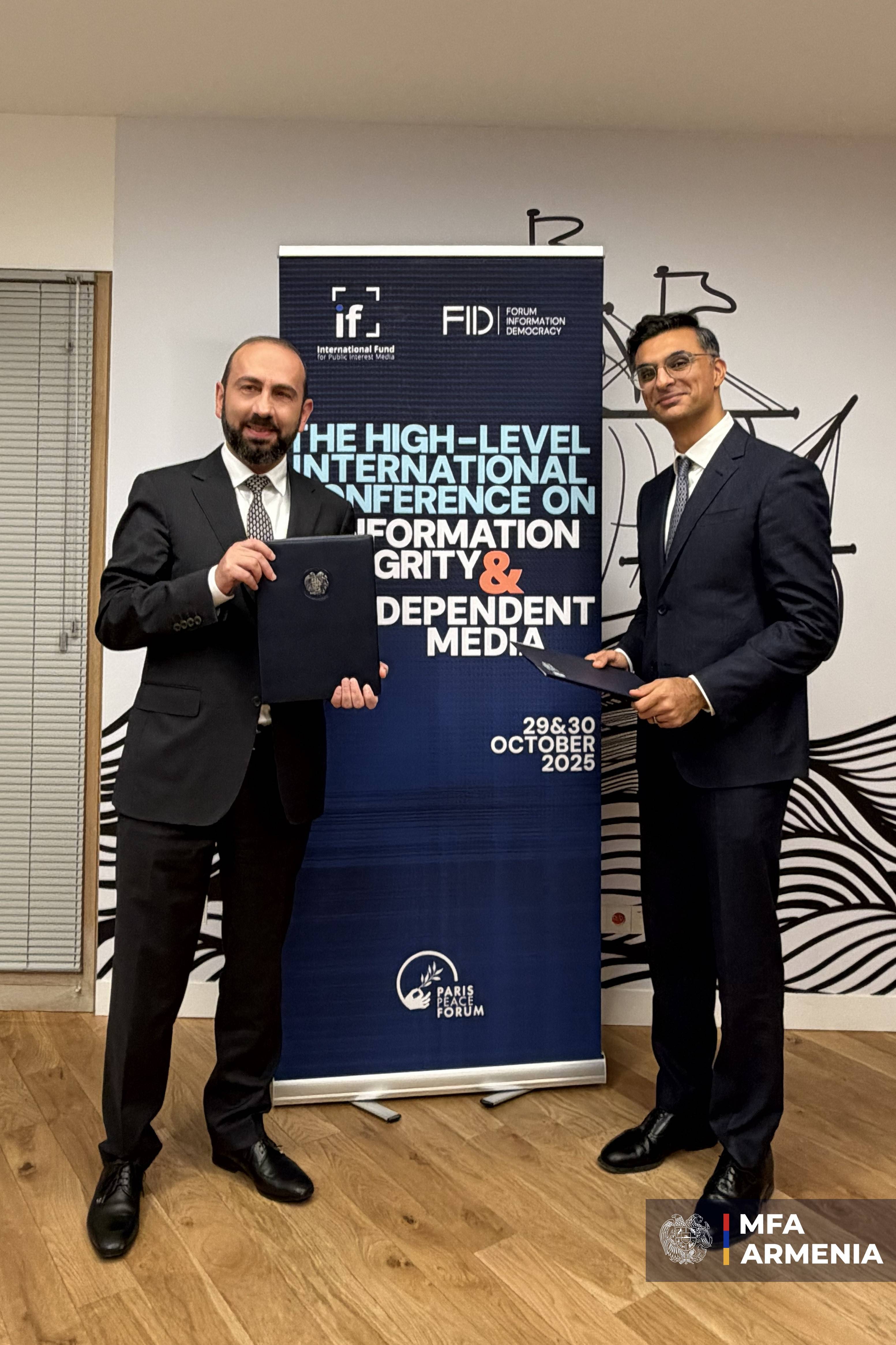 29 октября на полях 8-го Парижского форума мира министр иностранных дел Армении Арарат Мирзоян и исполнительный директор «Международного фонда в поддержку общественно значимых медиа»(IFPIM) Нишант Лалвани подписали меморандум о взаимопонимании.
