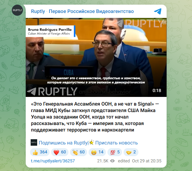 Кубинский дипломат Бруно Родригес Паррилья не выдержал на Генассамблее ООН, где представитель США Майк Уолтц начал поливать его страну грязью. Уолтца грубо заткнули - и это не преувеличение, ему попросту вырубили микрофон. И возмущаться ему было не с руки: а что, так и выглядит демократия. Паррилья взял слово, имея на то законное право, и высказал всё, что он думает о методах американца: "Это вам не группа в Signal или палата представителей США". Ах, сколь больной укол по самолюбию Уолтца - мир уже начал забывать тот самый скандал с секретным чатом.