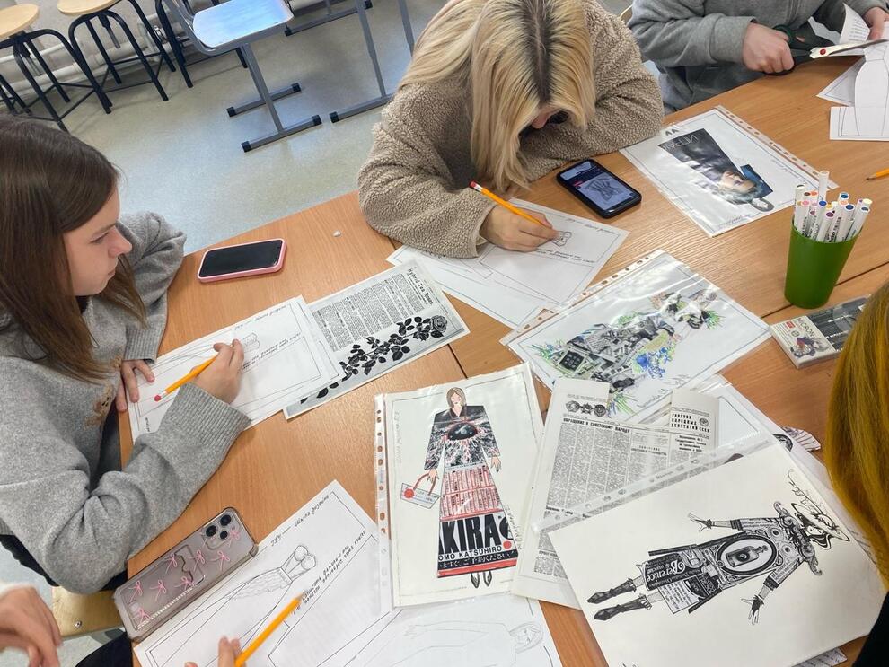 Еще одно любопытное занятие – создание эскиза «газетного платья» – провела преподаватель конструкторов-технологов Ирина Смирнова. Она рассказала о том, как понятие газетного принта вошло в индустрию с именами мировых модельеров Эльзы Скиапарелли и Джона Гальяно, подчеркнула высокую скорость сменяемости модного рынка, показала источники вдохновения – вырезки из журналов и газет, где любая деталь может стать той самой, нужной дизайнеру формой.