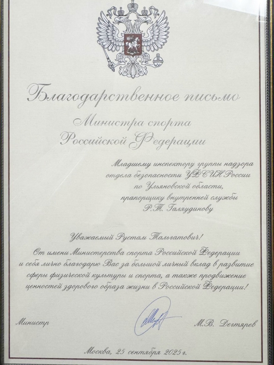 Рустам Галяутдинов, младший инспектор 2 категории отдела охраны исправительной колонии №9 УФСИН России по Ульяновской области, получил Благодарственное письмо от Министра спорта Российской Федерации Михаила Дегтярева. Это признание подчеркивает его выдающиеся достижения в области спорта и вклад в развитие физической культуры в регионе.