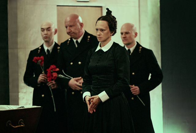 Спектакль вообще не заигрывает со зрителем. Он лишен привычных театральных удовольствий — занимательности, зрелищности, экспрессивности. Скуп на внешние средства. И при этом их точно отобранный минимум действует с удвоенной силой — как пусто-торжественный зал крематория и гроб, который выносят и устанавливают на возвышение в центре. Открывают для прощания — а в нем профиль усопшего. Смерть — это часть жизни, там есть быт, молчаливо и неукоснительно соблюдаемые ритуалы: вот сухощавая строгая женщина (Елена Морозова) поправляет цветы в вазах и следит за порядком; вот какая-то чужая старушка (Наталья Батрак) что-то деликатно жует в сторонке на лавке; вот молчаливый некто замер, обхватив голову; вот жена и дочь в новеньких траурных нарядах (Марьяна Спивак и Глафира Лебедева); вот сослуживцы (Кирилл Быркин, Антон Ескин, Владимир Белостоцкий), старающиеся сообразно приличиям изобразить скорбь, но живо занятые собой и служебными перспективами после смерти коллеги — только их гладкие, как бильярдные шары, голые черепа взблескивают, сближаясь и расходясь. Эта мелкая, штриховая, точно подмеченная режиссером и выписанная актерами суета у гроба так неотличима от обычной, еще недавно включавшей и покойного в свой круг, что не кажется дивом, когда выключенный из нее вдруг садится во гробе, медленно озирается, а потом и выбирается из него.