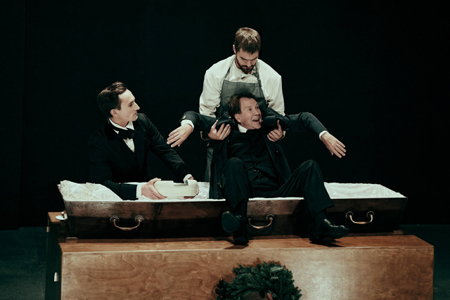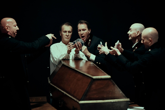 Гроб на этом высоком, прочном, торжественно-солидном постаменте так и стоит на всем протяжении спектакля — потом уходит вниз, как в крематории. Он занимает как будто весь объем маленького сценического пространства: люди стоят или ходят вокруг него — то есть обязаны считаться с его присутствием. Оно определяет в эту минуту их жизнь. А только ли в эту? Memento mori — напоминание о смерти, чужой или собственной, вездесущей и внезапной; ее не обойти — как вопрос, заданный в лоб. Над гробом, как над рабочим столом, передают по кругу служебные бумаги, на нем же, как на ломберном, весело играют в карты.