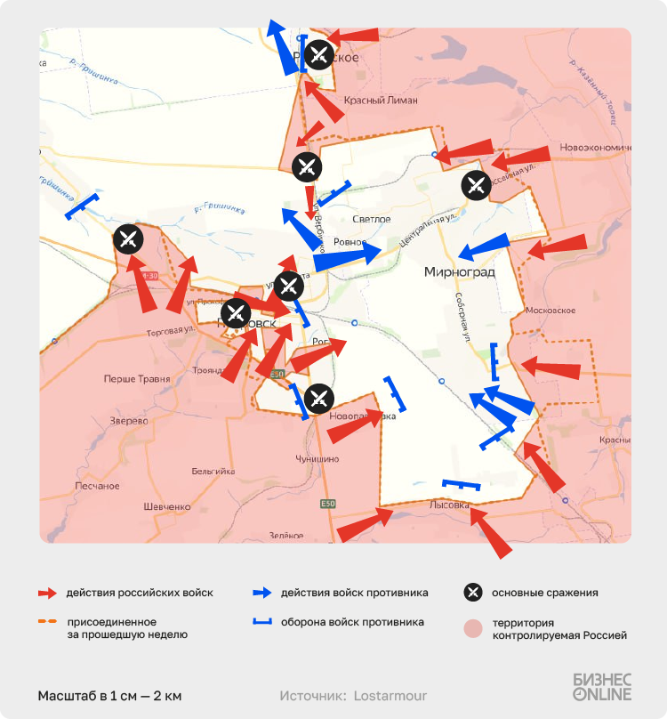 Непосредственно в Красноармейско-Димитровской агломерации зона контроля войск противника стремительно сужается, говорить о точной линии ЛБС трудно, ввиду того что наступление ВС РФ идет фрагментарно. Теоретически отдельные группы вооруженных формирований Украины могут оставаться в тылу российских войск.
