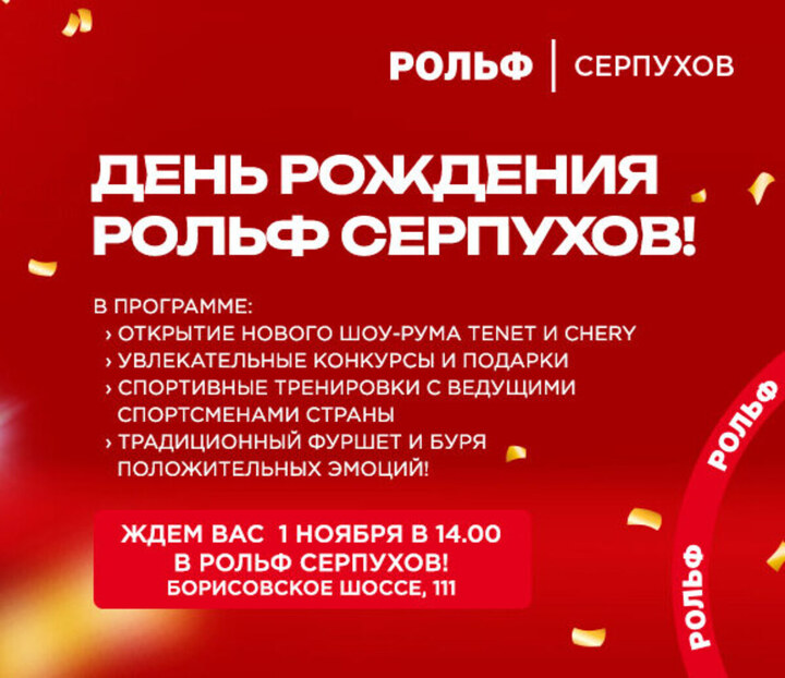 Серпухов, 1 ноября 2025 года. Дилерский центр «РОЛЬФ Серпухов» подведет итоги успешного года работы,  и представит городу две новых локации: современный шоурум Tenet РОЛЬФ Серпухов и спортивный зал, созданный в партнерстве с движением «Здоровое Отечество».