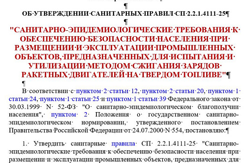 Разработанные санитарные правила определяют санитарно-эпидемиологические требования к обеспечению безопасности населения при размещении и эксплуатации промышленных объектов, предназначенных для испытания и утилизации методом сжигания зарядов ракетных двигателей на твердом топливе, в том числе к помещениям и оборудованию стендового комплекса, осуществлению производственного контроля, условиям труда.