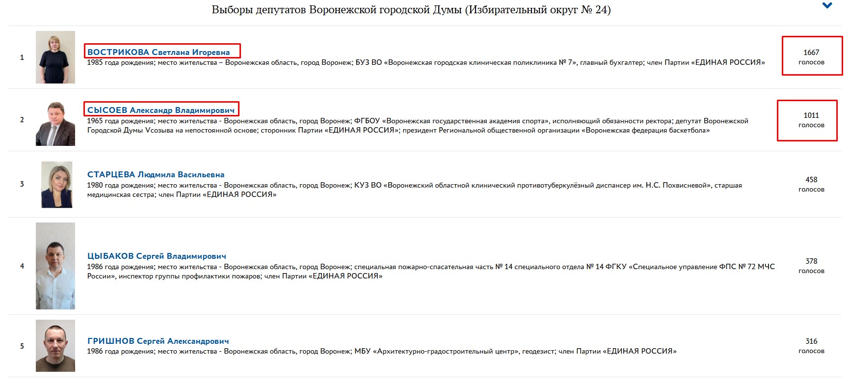 Александр Сысоев представляет одномандатный избирательный округ №24. В этом году перед выборами депутат находился в шаге от того, чтобы снова не получить мандат. Дело в том, что Сысоев проиграл праймериз «Единой России» бухгалтеру воронежской городской клинической поликлиники №7 Светлане Востриковой. При этом разрыв был серьезный. Сысоев набрал 1011 голосов, а Вострикова — 1667.