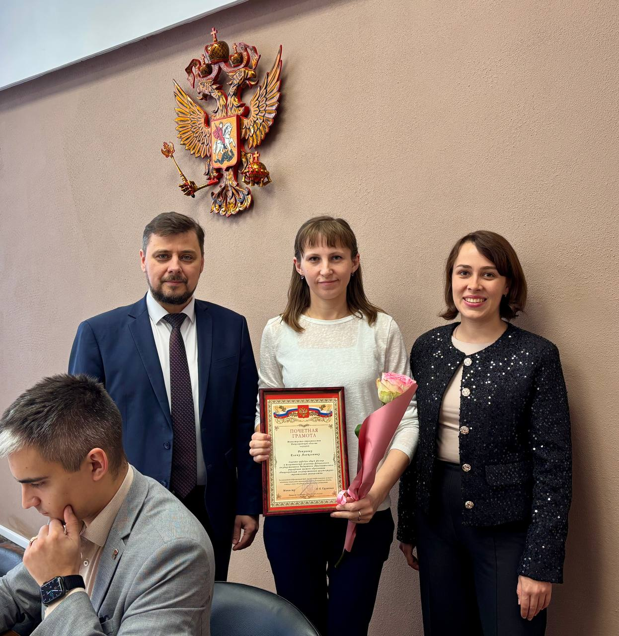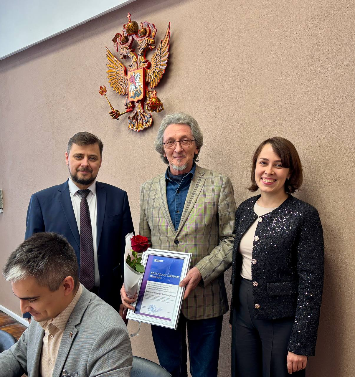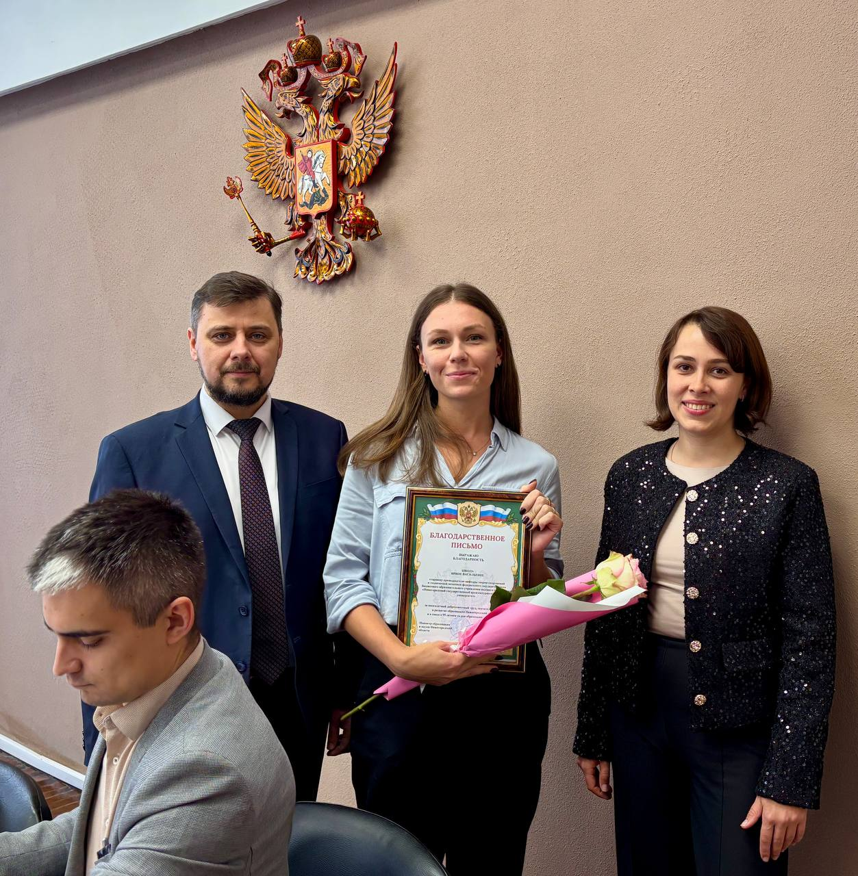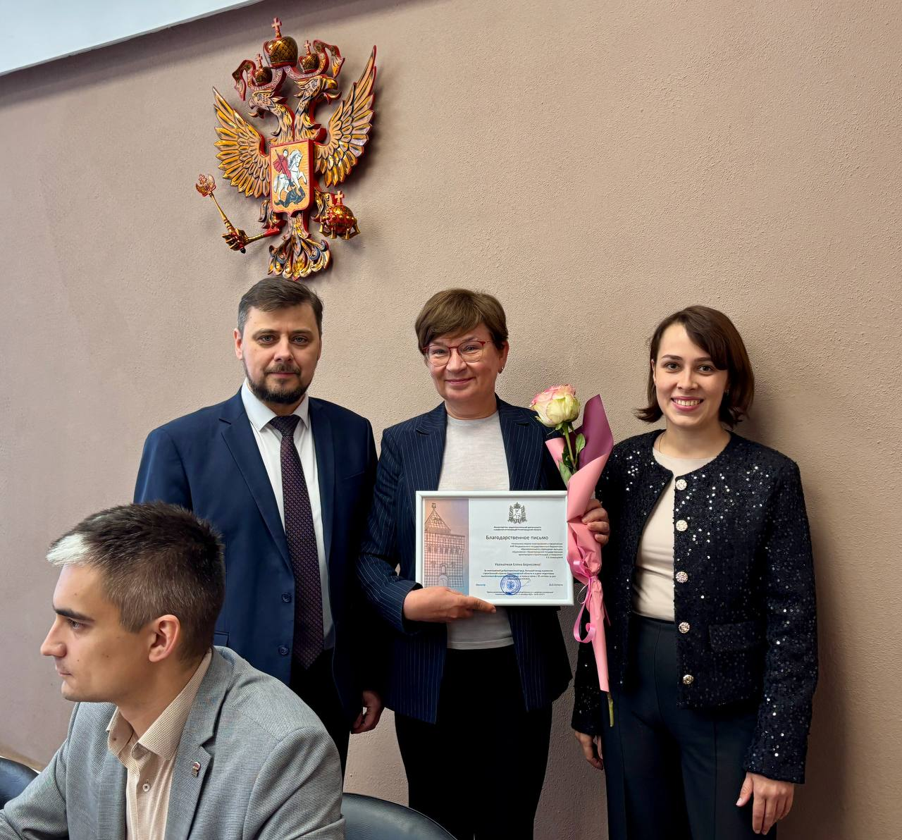 После награждения Екатерина Солнцева и советник при ректорате Владимир Бобылев поздравили Дмитрия Щеголева с днем рождения. Ему исполнилось 48 лет.