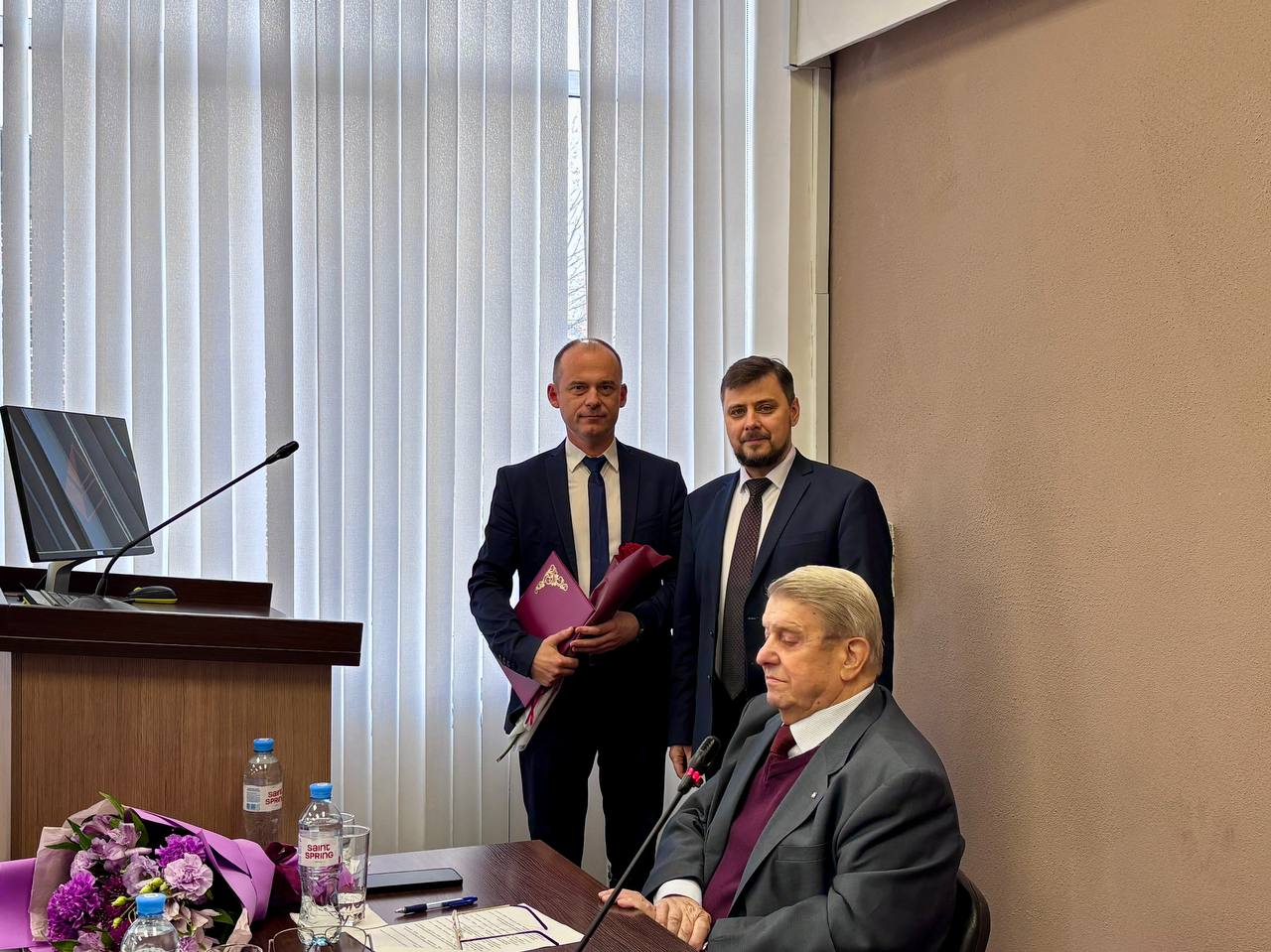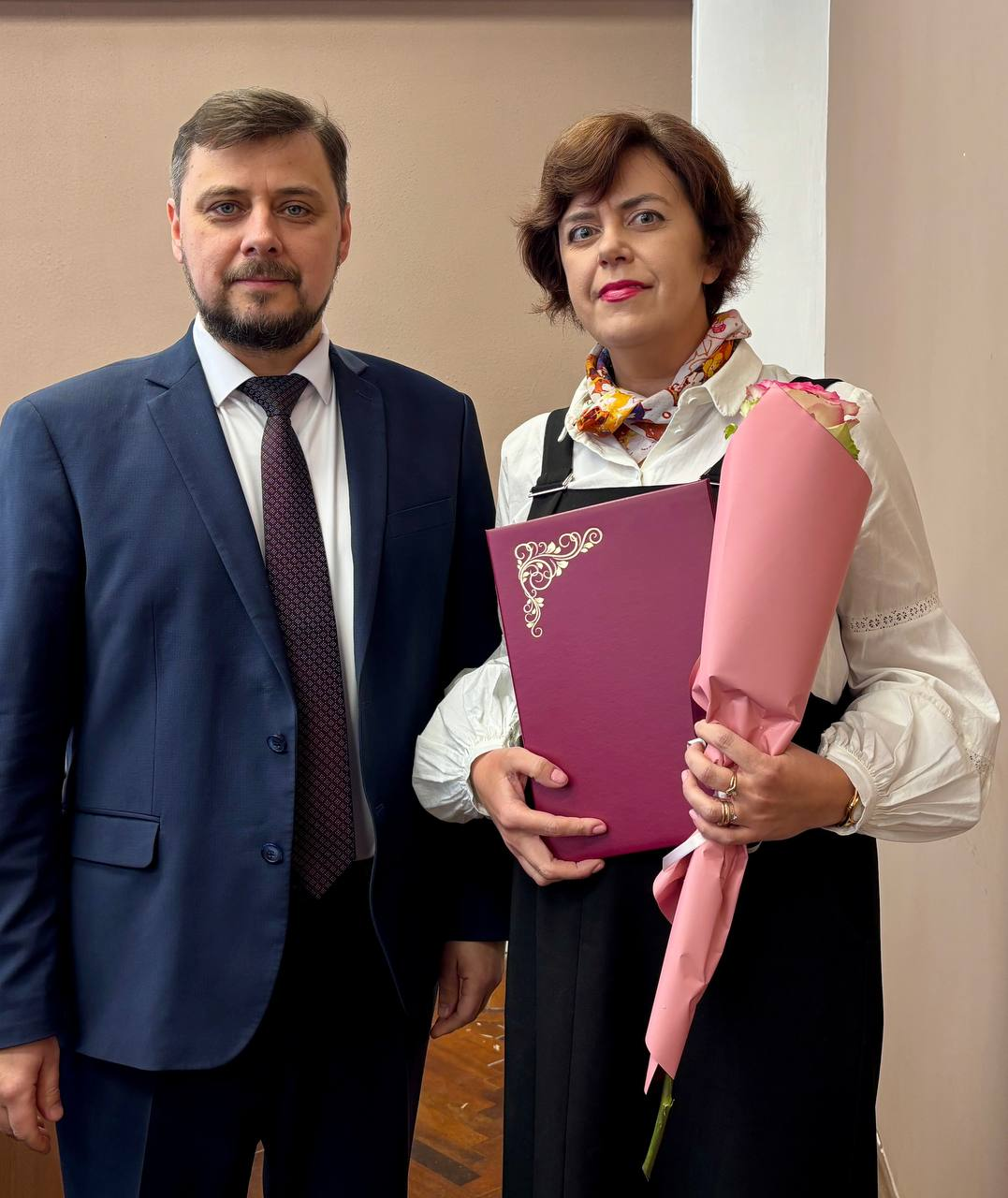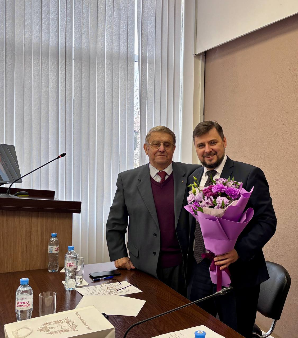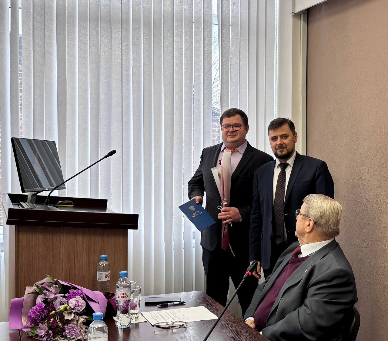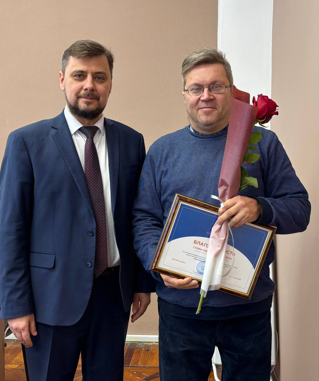 После награждения Екатерина Солнцева и советник при ректорате Владимир Бобылев поздравили Дмитрия Щеголева с днем рождения. Ему исполнилось 48 лет.
