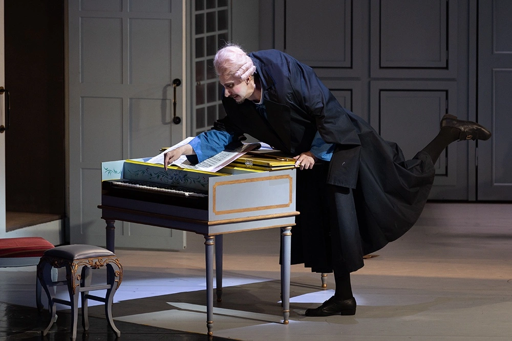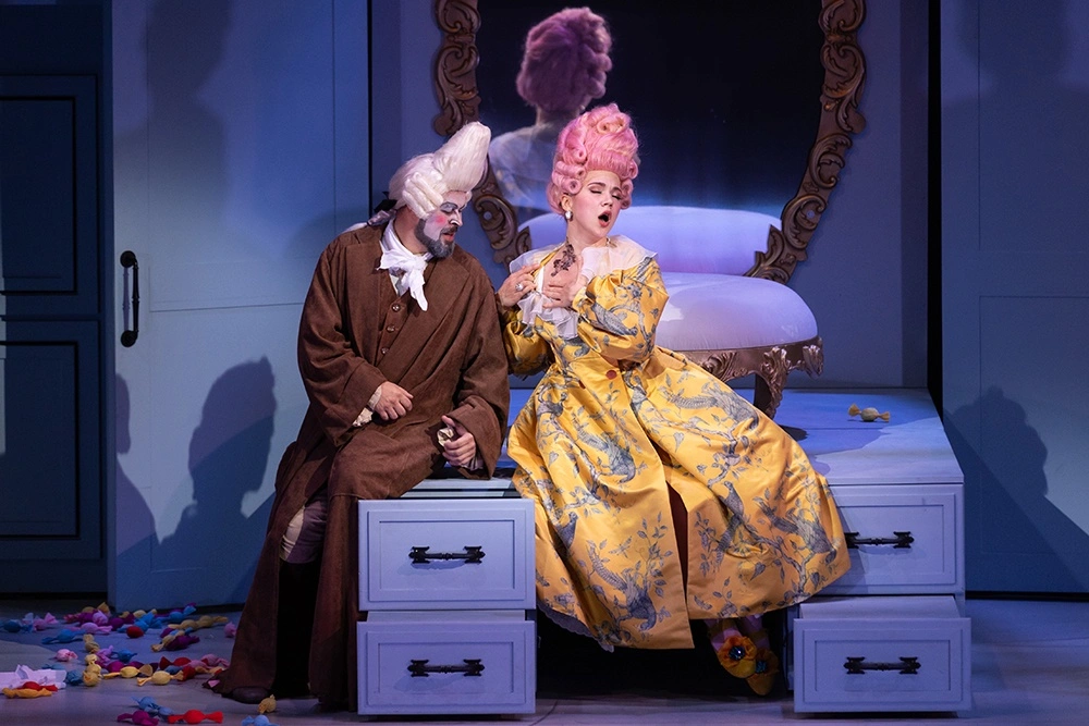Сценограф Ксения Кочубей считает, что жанр комической оперы требует игрового решения декораций, и ведущий образ спектакля - шкатулка с секретами, она же шкаф со скелетами, она же шкатулка с крутящейся фигуркой балерины.