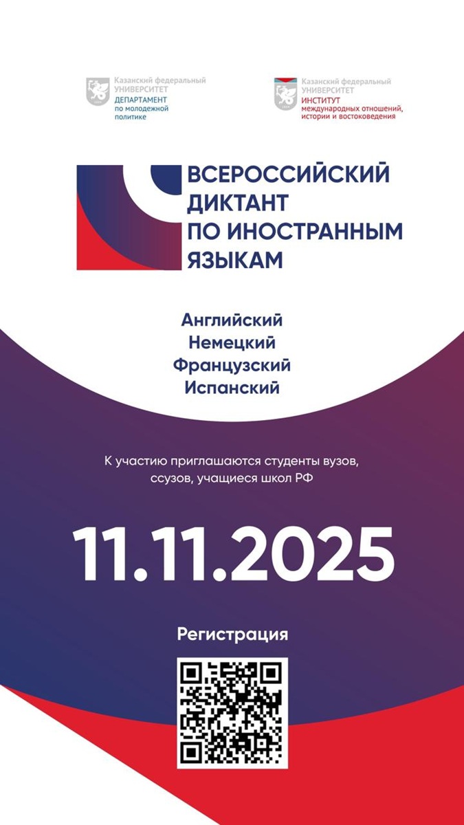 11 ноября 2025 года Институт международных отношений, истории и востоковедения Казанского федерального университета совместно с Департаментом по молодежной политике, социальным вопросам и развитию системы физкультурно-спортивного воспитания проведут Всероссийский диктант по английскому языку.
