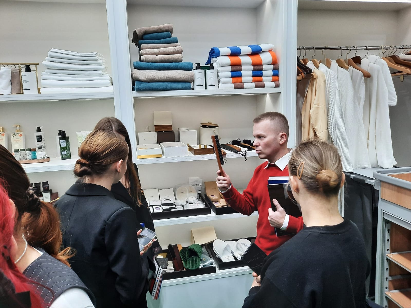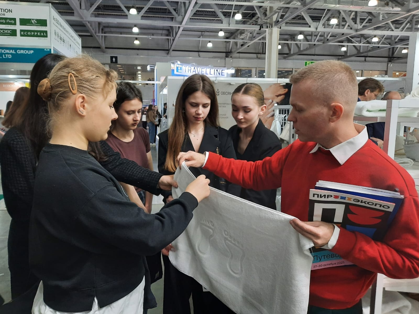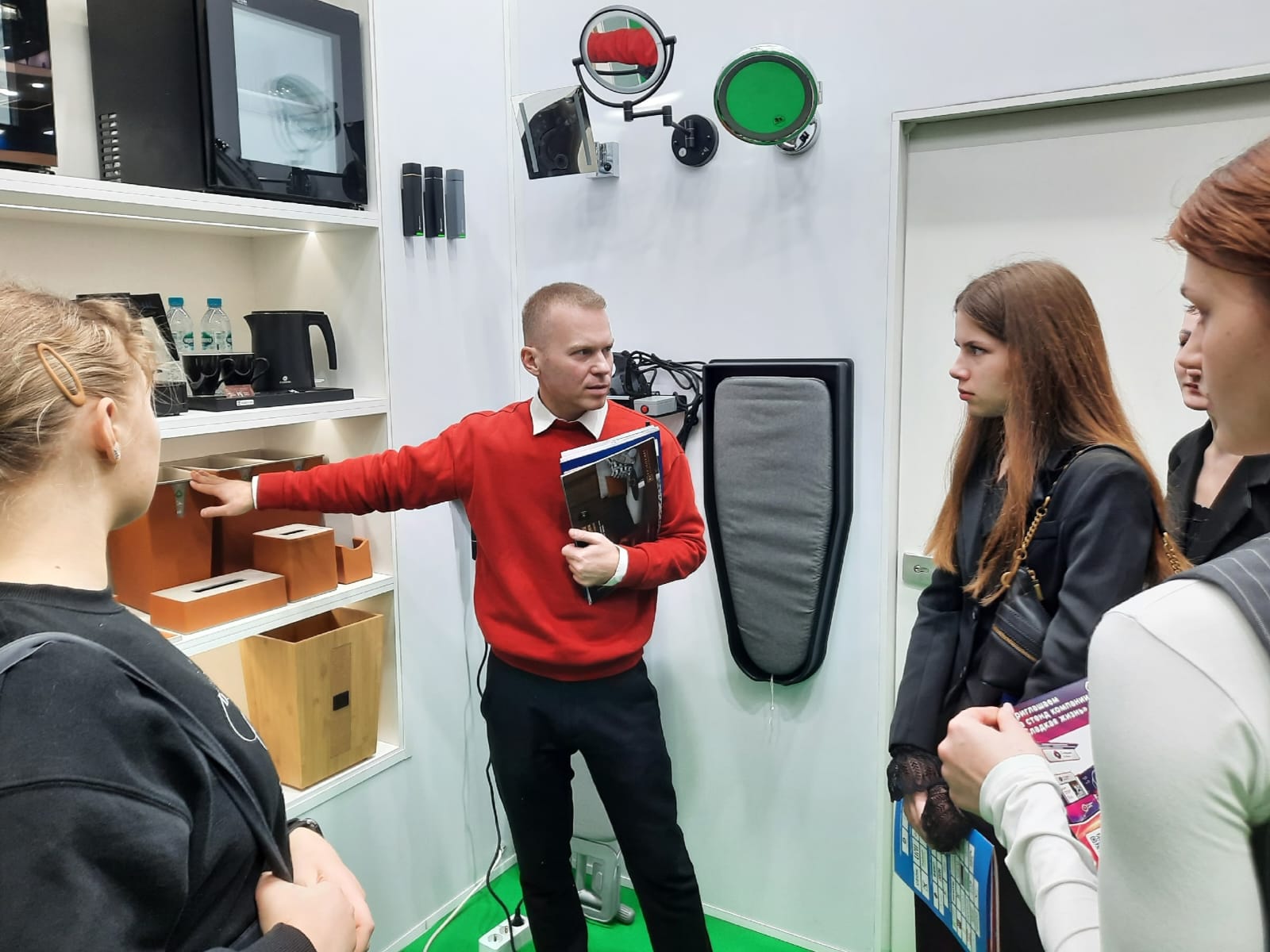 Первая часть учебного занятия была посвящена ознакомлению обучающихся с экспозицией и участниками выставки. Заведующий кафедрой Арсений Р.М. и преподаватели кафедры Мезинова А.А., Пьянова Е.А. и Шлык В.С. рассказали об особенностях комплектации гостиничных номеров в зависимости от их категорий, охарактеризовали элементы комфорта, представленные на стендах поставщиков-экспонентов выставки.