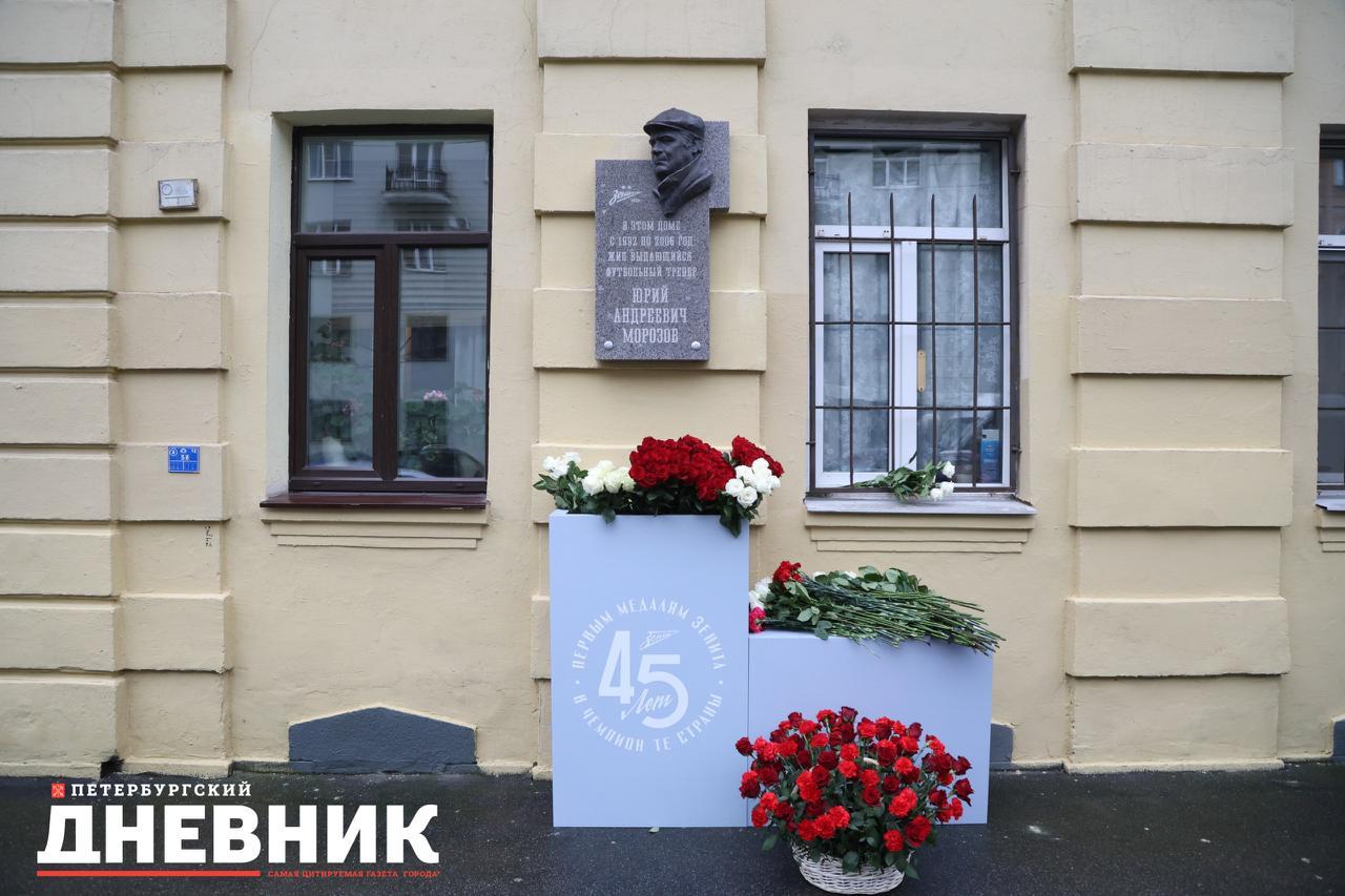 К мемориальной доске участники церемонии возложили цветы под звуки гимна болельщиков «Зенита» на мелодию песни Соловьева-Седого «Город над вольной Невой».