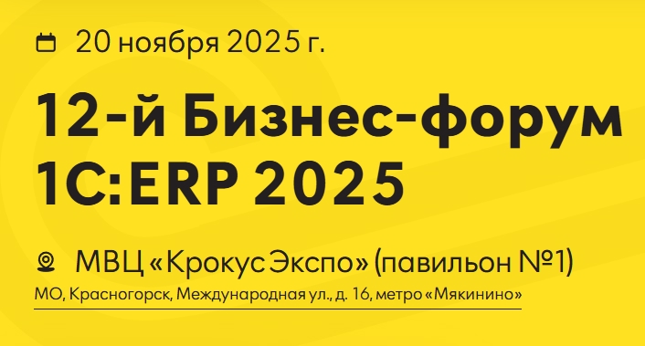 Фирма "1С" приглашает пользователей, потенциальных клиентов и партнеров принять участие в 12-м Бизнес-форуме 1С:ERP, посвященном обмену опытом по проектам внедрения 1С:ERP и других решений "1С", новым возможностям повышения эффективности управления и учета. Форум пройдет 20 ноября 2025 года в Москве, в МВЦ "Крокус Экспо".