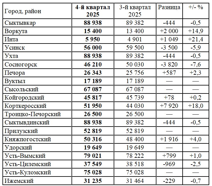 В семи муниципалитетах стоимость увеличится, в семи — уменьшится. Самое значительное изменение в денежном выражении произойдет по Корткеросскому району (плюс 7920 рублей), Сосногорску (плюс 3820 рублей) и Усинску (минус 3,5 тысячи рублей).