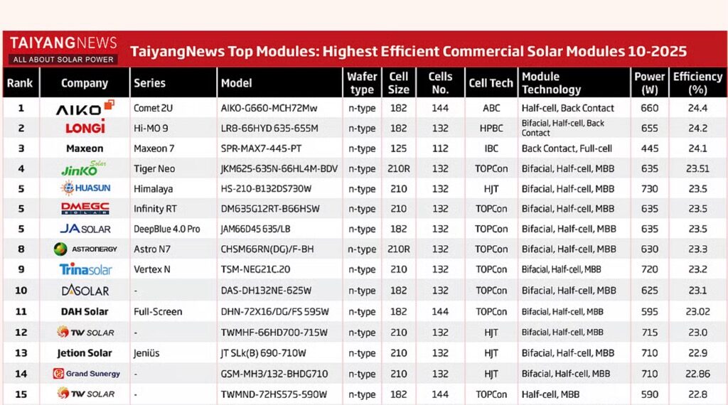 Самый мощный в рейтинге — модуль Huasun Himalaya (730 Вт, HJT). Его эффективность составляет 23,5% (пятое место).