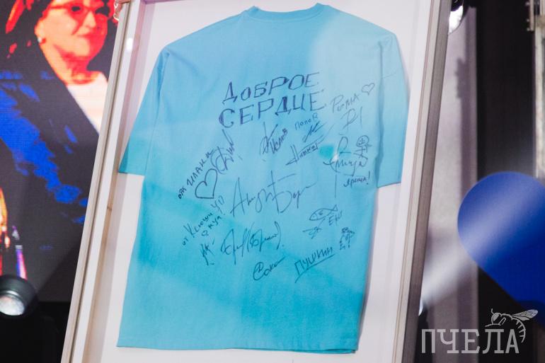 Серьёзным вкладом в сумму собранных средств стали аукцион и благотворительная лотерея. Уникальный лот — футболка с автографами звёзд коллектива «Уральские пельмени» Андрея Рожкова, Дмитрия Соколова, Максима Ярицы, Данилы Пяткова за 110000 рублей приобрели сотрудники завода «Гидрокомплект», генерального партнёра благотворительного вечера. Кстати, эту футболку разыграли уже в третий раз. А всего за неё за три года удалось собрать больше 600 тысяч рублей!