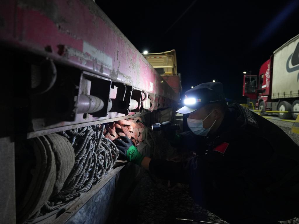 2 июня 2025 года, на КПП Иркештам в Синьцзян-Уйгурском автономном районе дежурные пограничники проводят досмотр въезжающих транспортных средств. /Фото: Синьхуа/