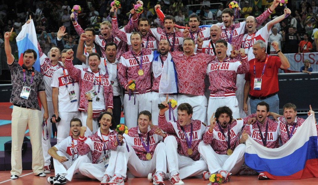 Команда сборной России, завоевавшая золотые медали в мужском волейбольном турнире XXX летних Олимпийских игр в Лондоне, во время церемонии награждения. Фото: Автор: Владимир Песня / РИА Новости