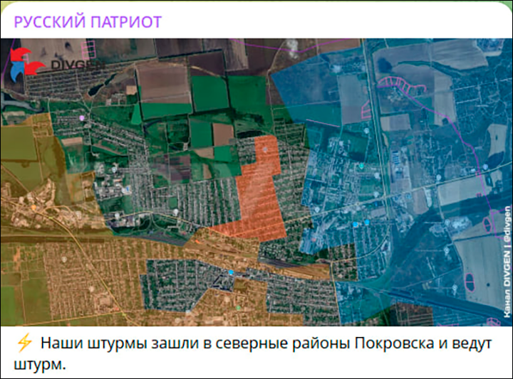 Так, сообщается, что наши войска продвинулись в микрорайоне Динасовый посёлок на 1,5 км и зашли в северные районы Покровска. Идёт штурм. Порядка 80% города под контролем ВС России, противник заблокирован.