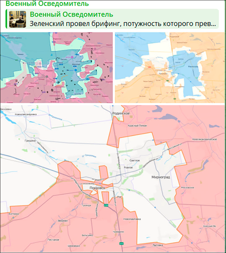 Судя по всему, на Банковой понимают, что Покровск и Мирноград фактически в окружении, но приказа на отход по-прежнему не дают, а пытаются прорвать его, при этом ситуация особо не меняется, пишет украинский инсайдерский канал "Женщина с косой". Информацию о положении войск стараются не выпускать наружу, поэтому в официальных сводках вместо слова "котёл" звучит аккуратное "серая зона". На деле каждый день промедления превращает выход из покровской воронки в смертельную лотерею: